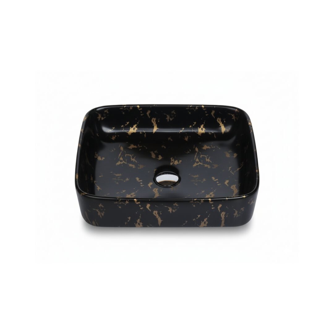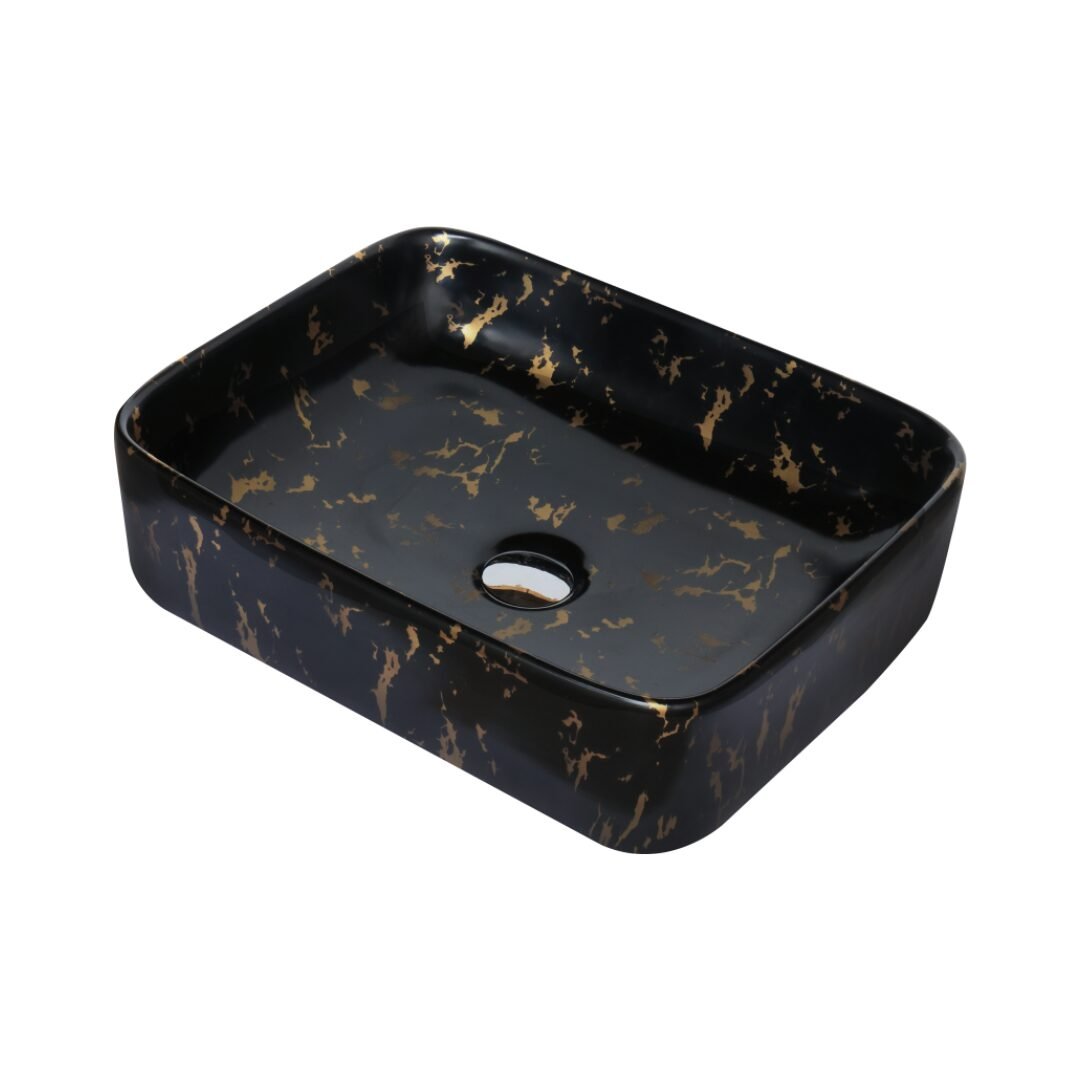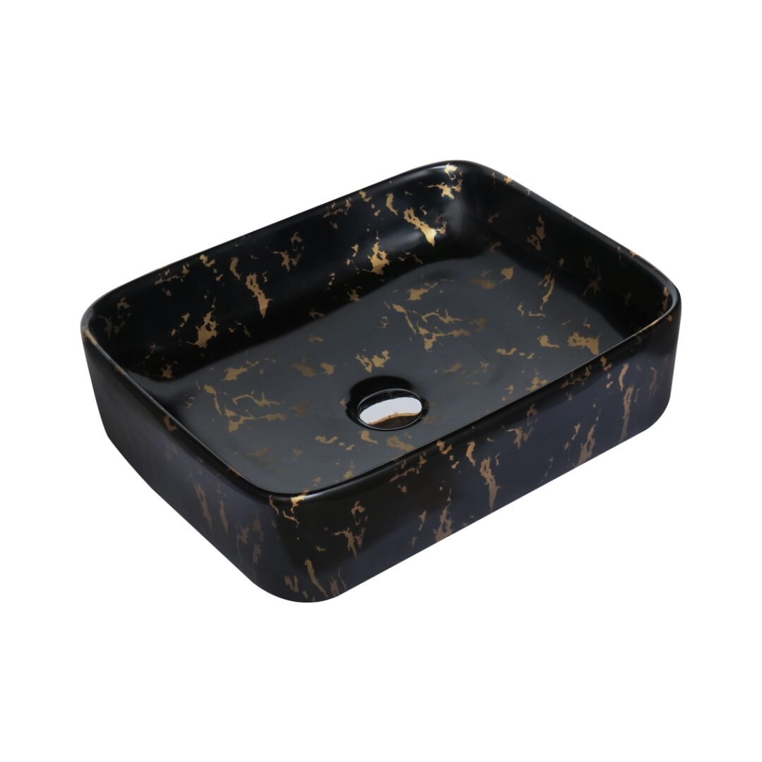 This is a stylish and modern rectangular ceramic wash basin, perfect for enhancing the aesthetic appeal of any bathroom. The basin features a pristine white base adorned with an elegant gold marble vein pattern, giving it a luxurious and contemporary look. Its glossy finish adds a touch of sophistication while making the surface easy to clean and maintain. The gently curved edges provide a sleek and smooth appearance, ensuring it blends seamlessly with various bathroom styles. The basin is designed for countertop installation, making it ideal for vanity setups in both residential and commercial spaces. It includes a central drain hole, compatible with standard drain fittings, ensuring efficient water drainage. Its compact yet practical design provides ample space for everyday use while maintaining a minimalist profile. This wash basin is an excellent choice for those seeking to combine functionality with high-end design.