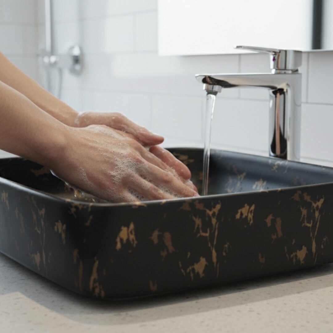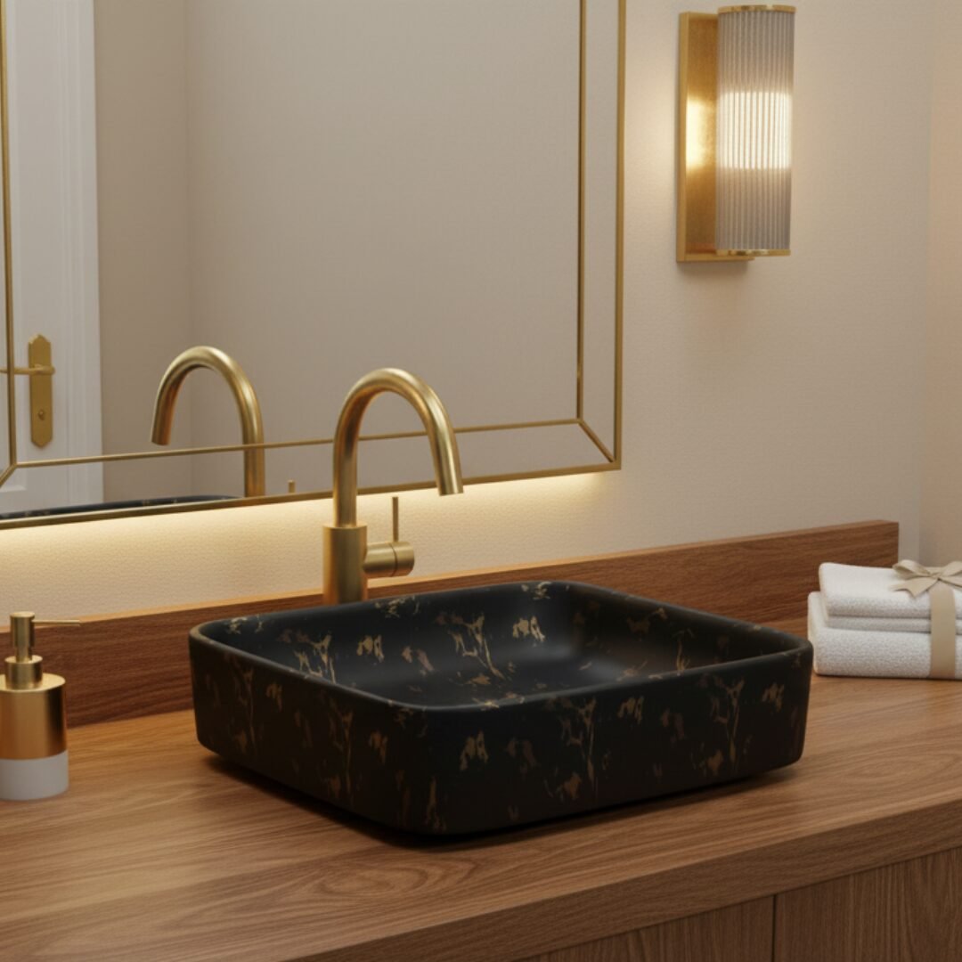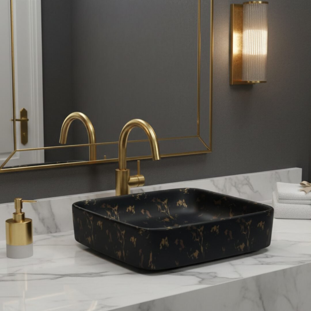 This is a stylish and modern rectangular ceramic wash basin, perfect for enhancing the aesthetic appeal of any bathroom. The basin features a pristine white base adorned with an elegant gold marble vein pattern, giving it a luxurious and contemporary look. Its glossy finish adds a touch of sophistication while making the surface easy to clean and maintain. The gently curved edges provide a sleek and smooth appearance, ensuring it blends seamlessly with various bathroom styles. The basin is designed for countertop installation, making it ideal for vanity setups in both residential and commercial spaces. It includes a central drain hole, compatible with standard drain fittings, ensuring efficient water drainage. Its compact yet practical design provides ample space for everyday use while maintaining a minimalist profile. This wash basin is an excellent choice for those seeking to combine functionality with high-end design.