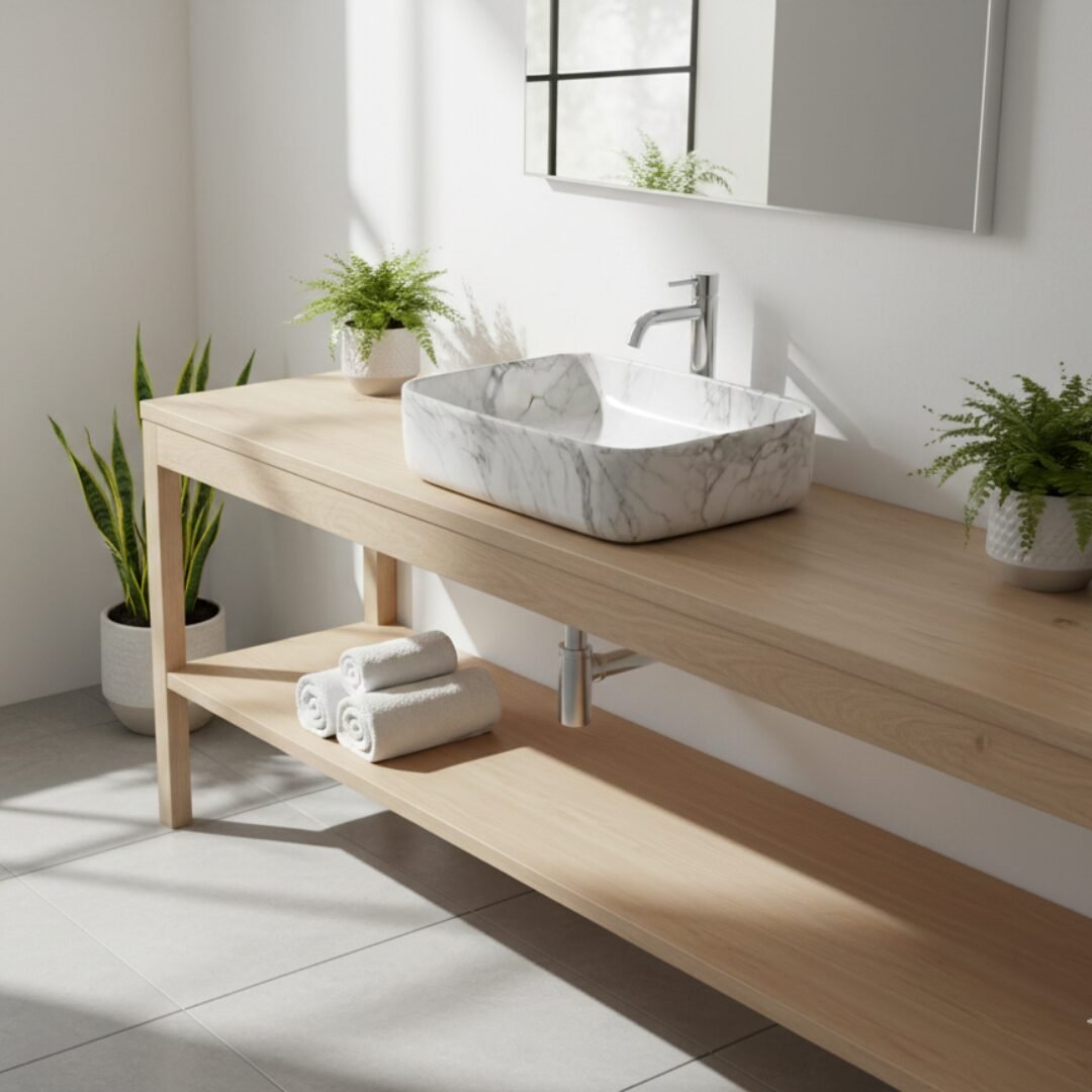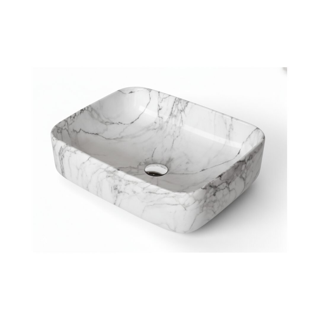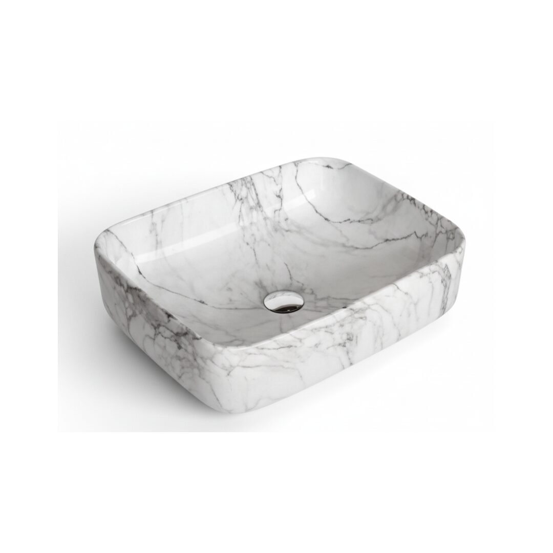 This is a stylish and modern rectangular ceramic wash basin, perfect for enhancing the aesthetic appeal of any bathroom. The basin features a pristine white base adorned with an elegant gold marble vein pattern, giving it a luxurious and contemporary look. Its glossy finish adds a touch of sophistication while making the surface easy to clean and maintain. The gently curved edges provide a sleek and smooth appearance, ensuring it blends seamlessly with various bathroom styles. The basin is designed for countertop installation, making it ideal for vanity setups in both residential and commercial spaces. It includes a central drain hole, compatible with standard drain fittings, ensuring efficient water drainage. Its compact yet practical design provides ample space for everyday use while maintaining a minimalist profile. This wash basin is an excellent choice for those seeking to combine functionality with high-end design.