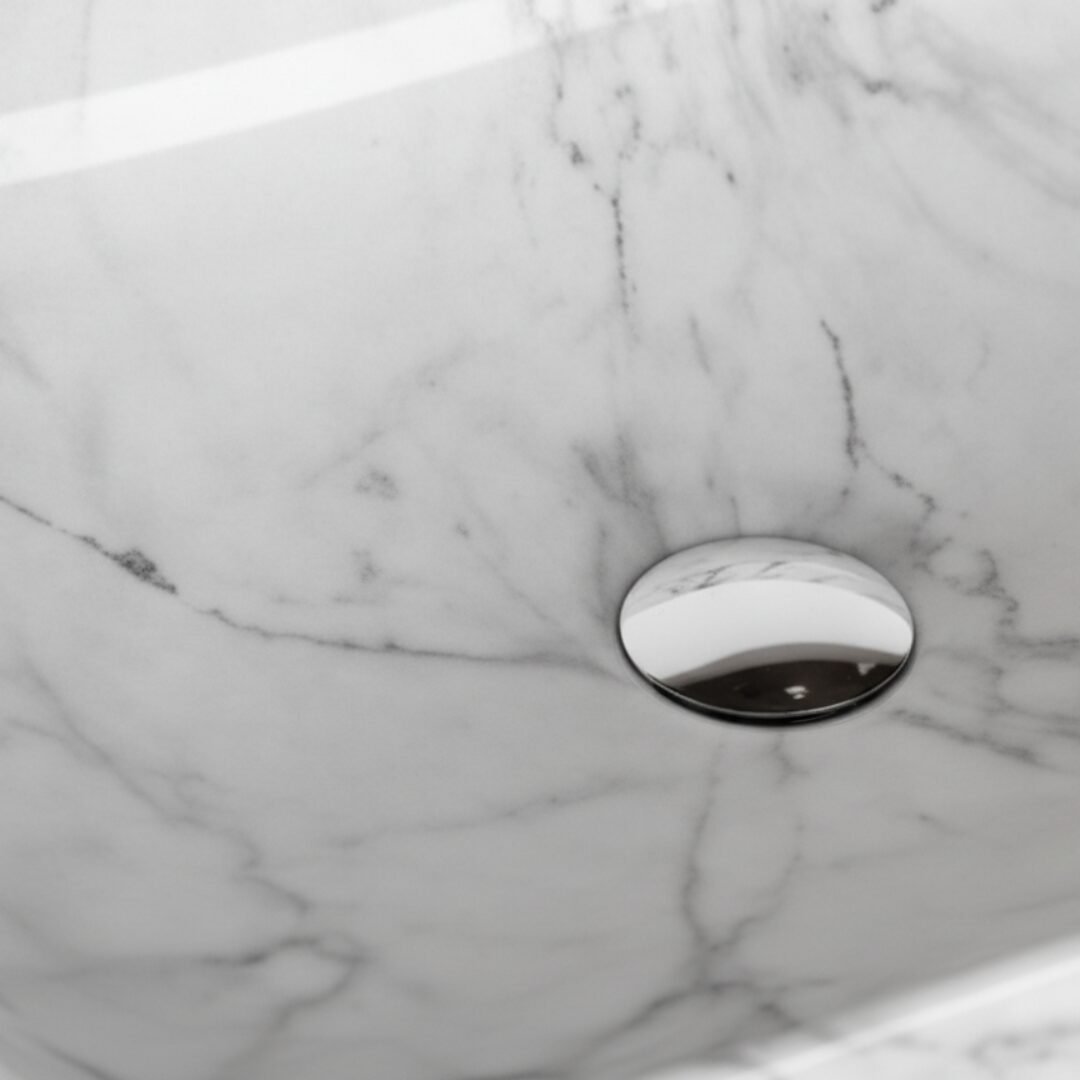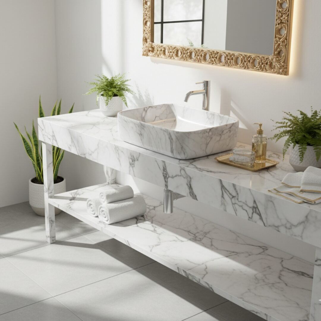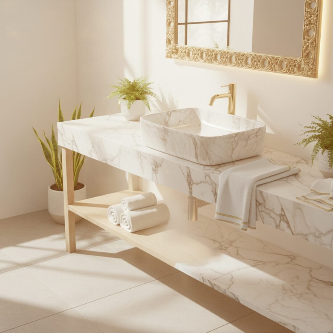 This is a stylish and modern rectangular ceramic wash basin, perfect for enhancing the aesthetic appeal of any bathroom. The basin features a pristine white base adorned with an elegant gold marble vein pattern, giving it a luxurious and contemporary look. Its glossy finish adds a touch of sophistication while making the surface easy to clean and maintain. The gently curved edges provide a sleek and smooth appearance, ensuring it blends seamlessly with various bathroom styles. The basin is designed for countertop installation, making it ideal for vanity setups in both residential and commercial spaces. It includes a central drain hole, compatible with standard drain fittings, ensuring efficient water drainage. Its compact yet practical design provides ample space for everyday use while maintaining a minimalist profile. This wash basin is an excellent choice for those seeking to combine functionality with high-end design.