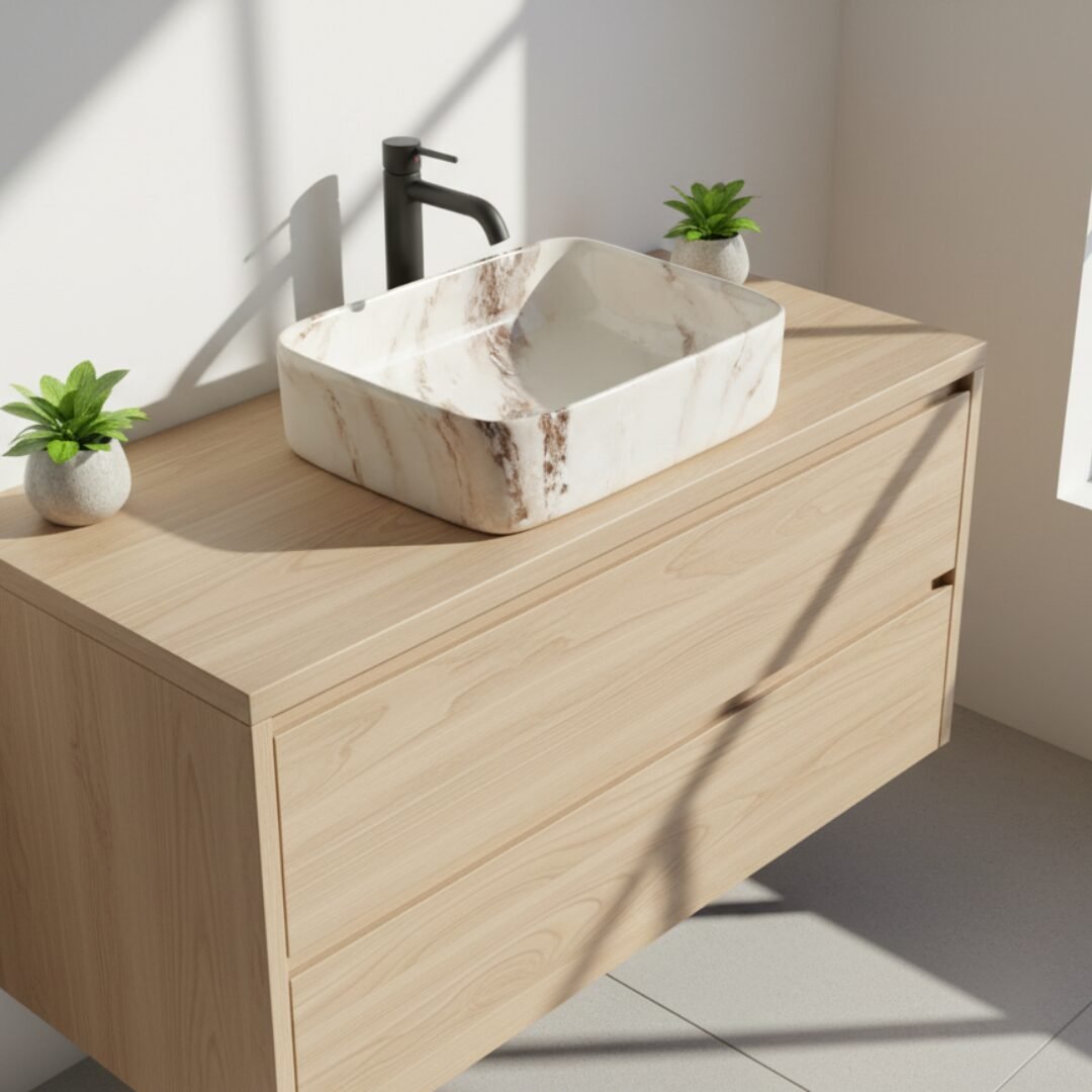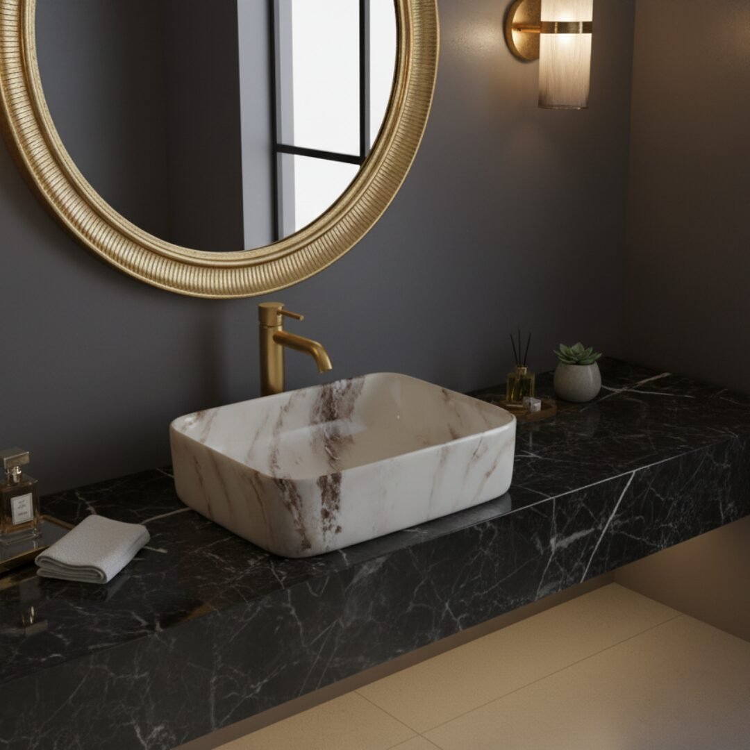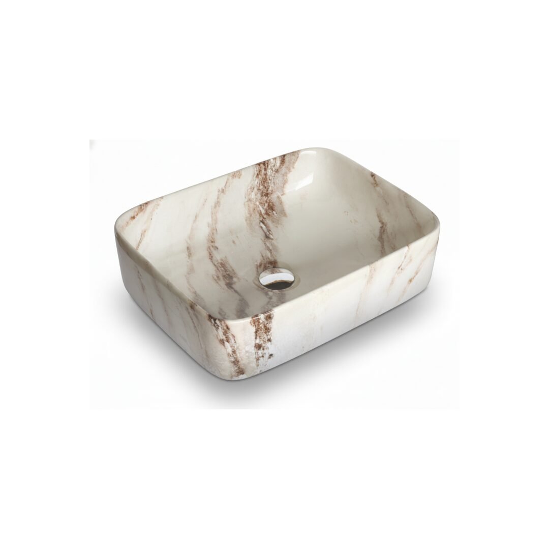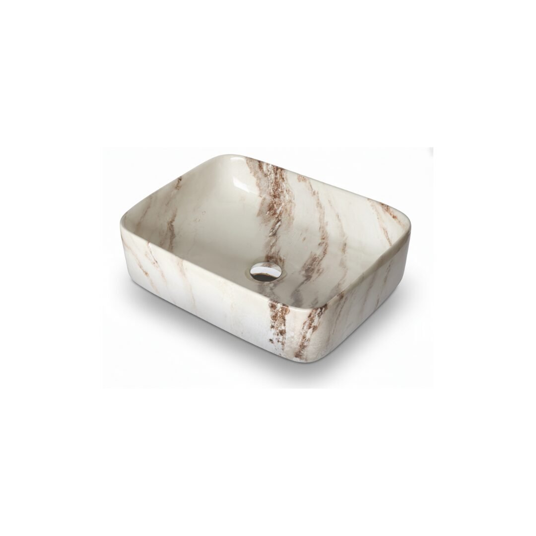 This is a stylish and modern rectangular ceramic wash basin, perfect for enhancing the aesthetic appeal of any bathroom. The basin features a pristine white base adorned with an elegant gold marble vein pattern, giving it a luxurious and contemporary look. Its glossy finish adds a touch of sophistication while making the surface easy to clean and maintain. The gently curved edges provide a sleek and smooth appearance, ensuring it blends seamlessly with various bathroom styles. The basin is designed for countertop installation, making it ideal for vanity setups in both residential and commercial spaces. It includes a central drain hole, compatible with standard drain fittings, ensuring efficient water drainage. Its compact yet practical design provides ample space for everyday use while maintaining a minimalist profile. This wash basin is an excellent choice for those seeking to combine functionality with high-end design.