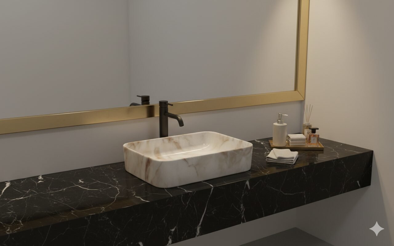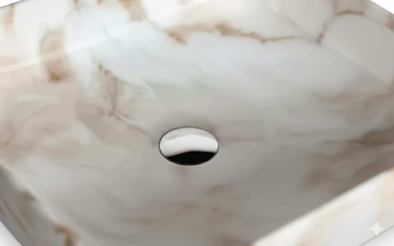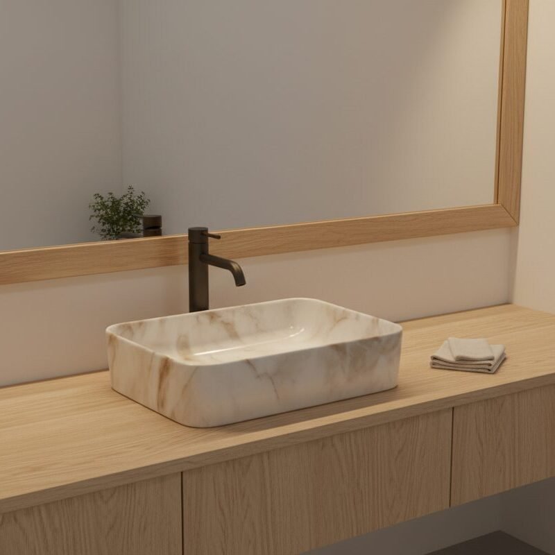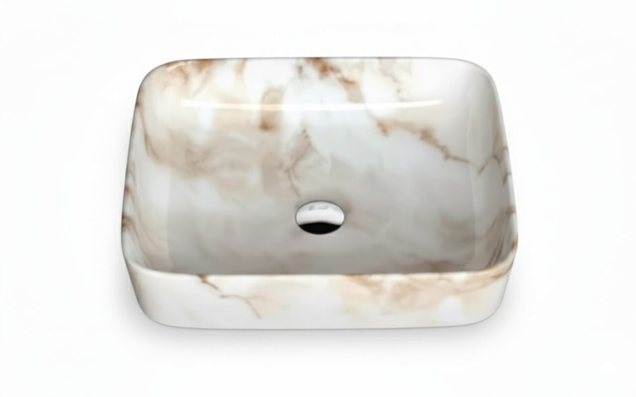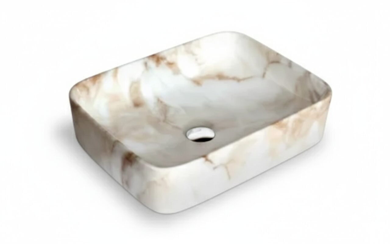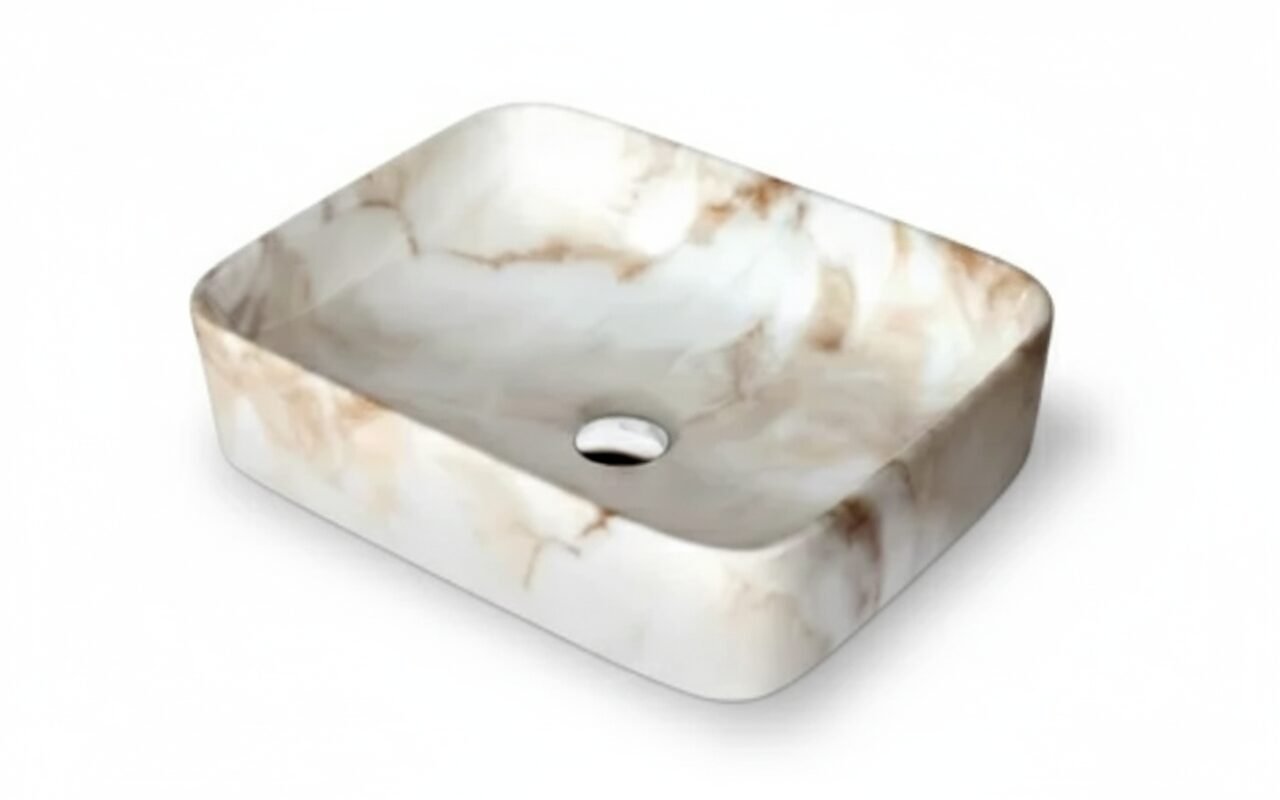 This is a stylish and modern rectangular ceramic wash basin, perfect for enhancing the aesthetic appeal of any bathroom. The basin features a pristine white base adorned with an elegant gold marble vein pattern, giving it a luxurious and contemporary look. Its glossy finish adds a touch of sophistication while making the surface easy to clean and maintain. The gently curved edges provide a sleek and smooth appearance, ensuring it blends seamlessly with various bathroom styles. The basin is designed for countertop installation, making it ideal for vanity setups in both residential and commercial spaces. It includes a central drain hole, compatible with standard drain fittings, ensuring efficient water drainage. Its compact yet practical design provides ample space for everyday use while maintaining a minimalist profile. This wash basin is an excellent choice for those seeking to combine functionality with high-end design.