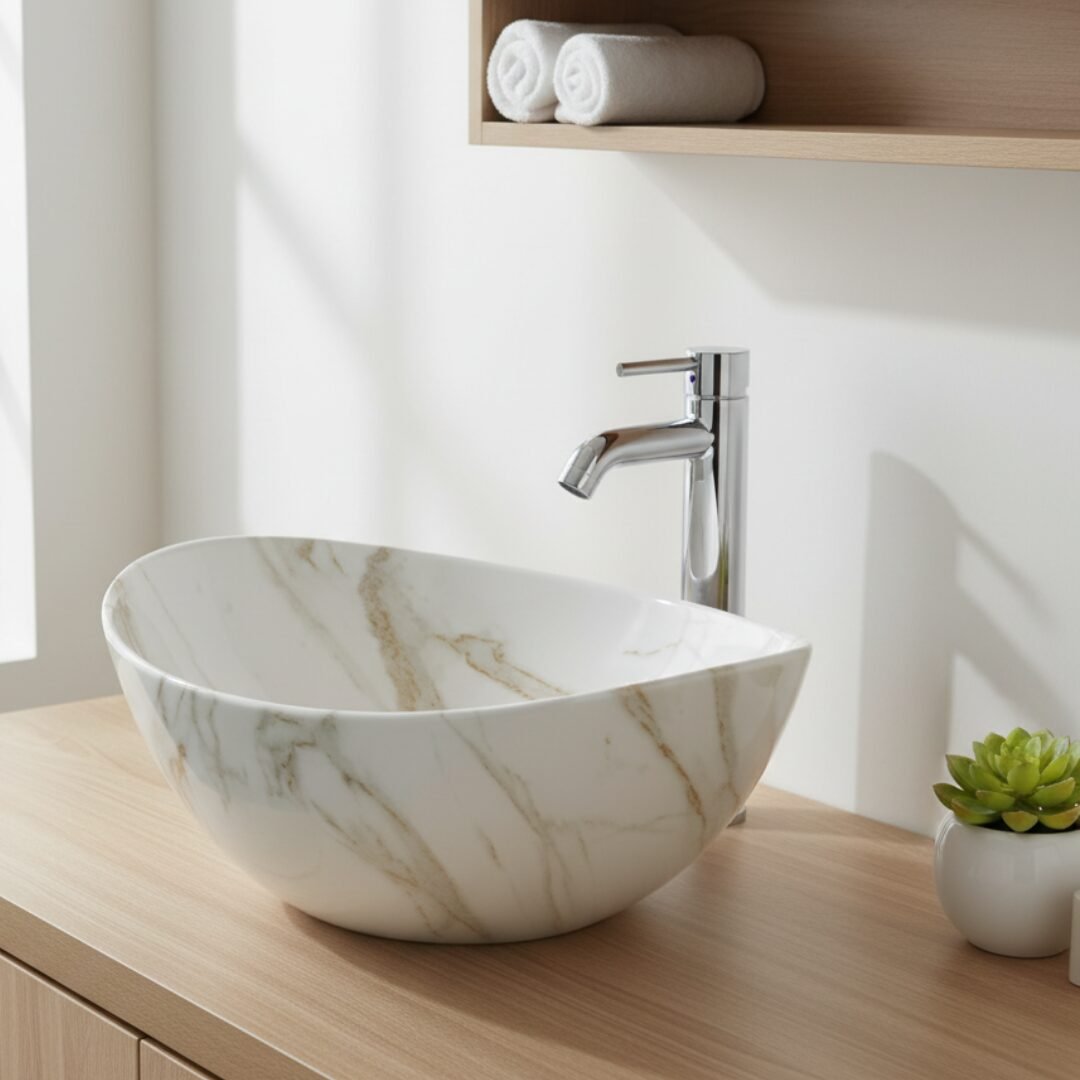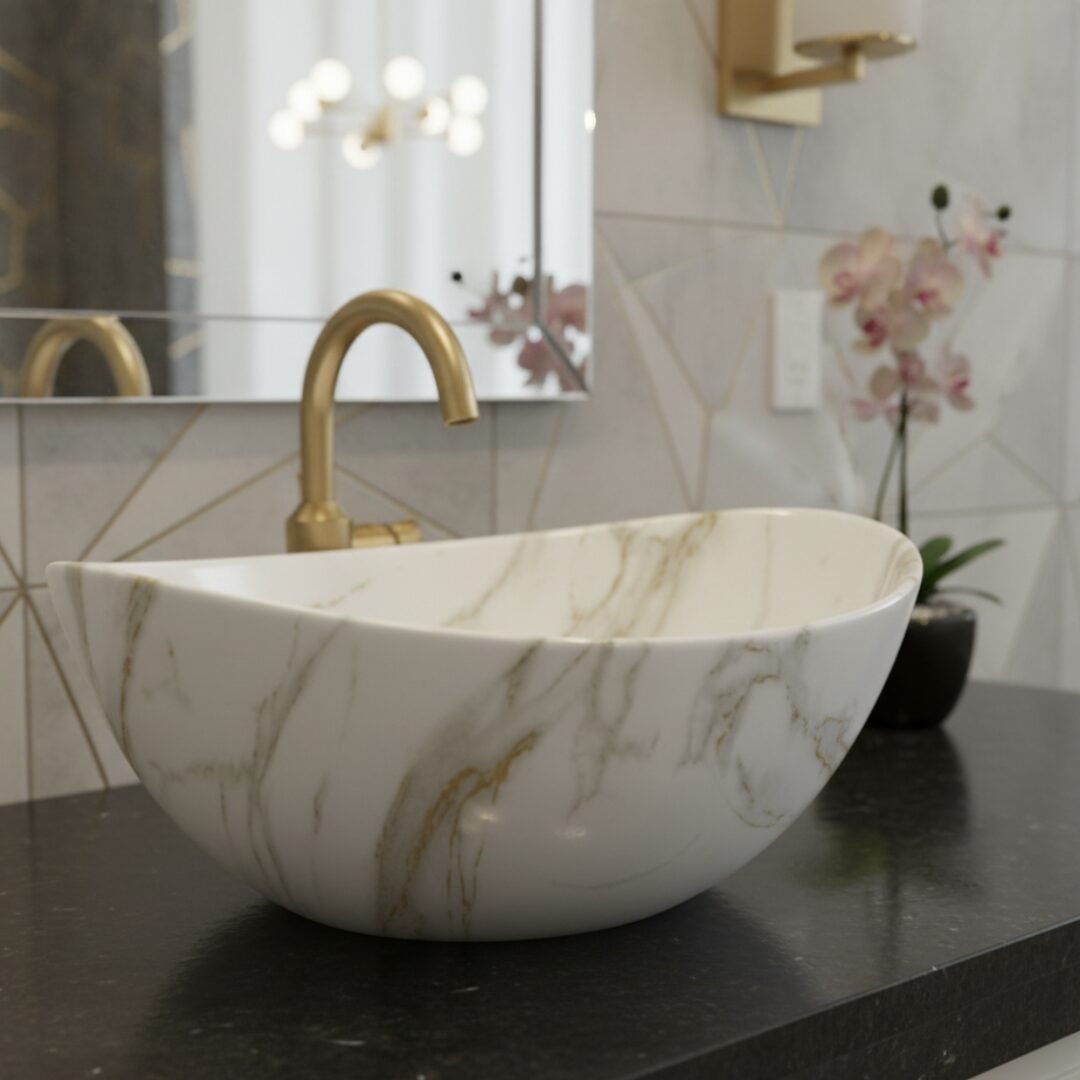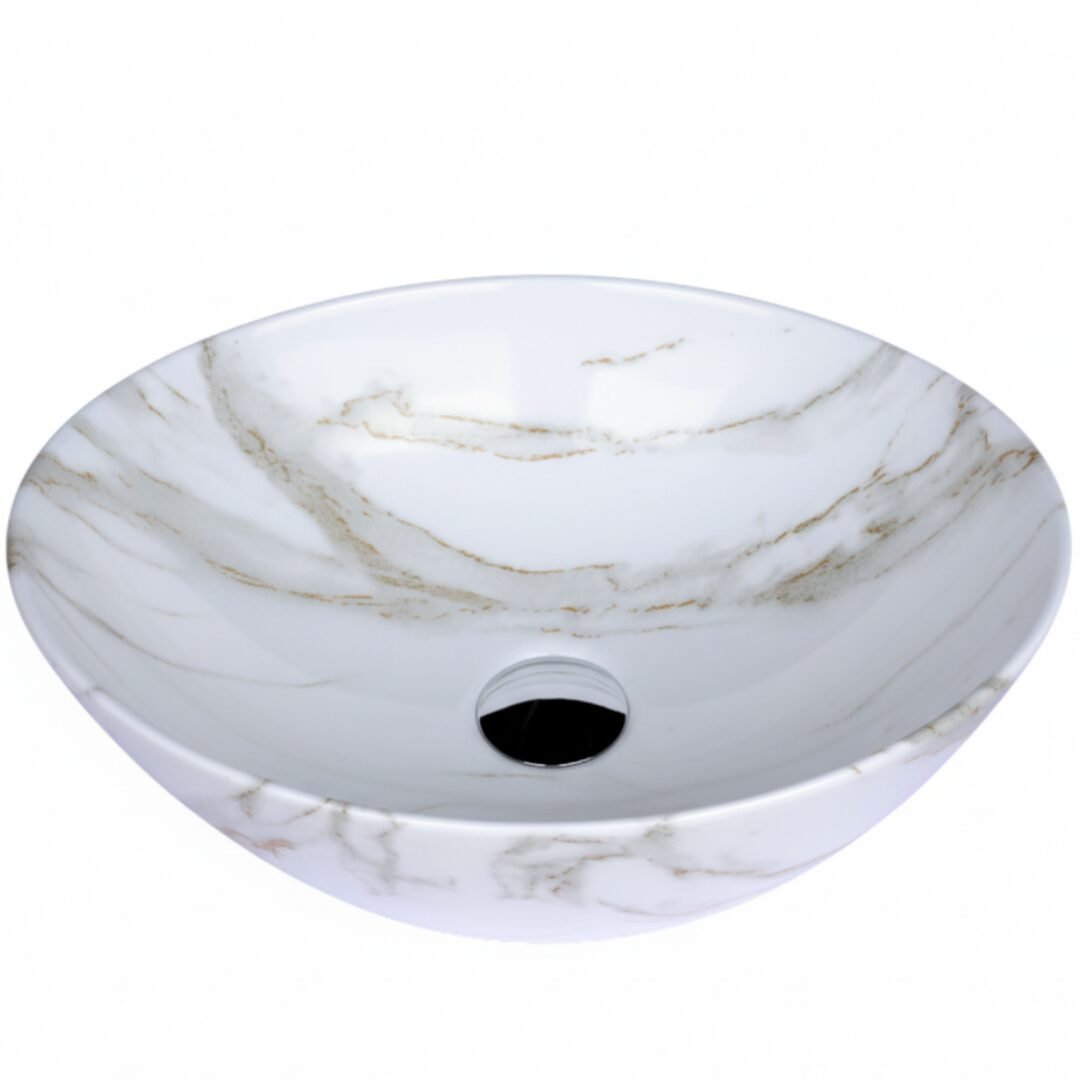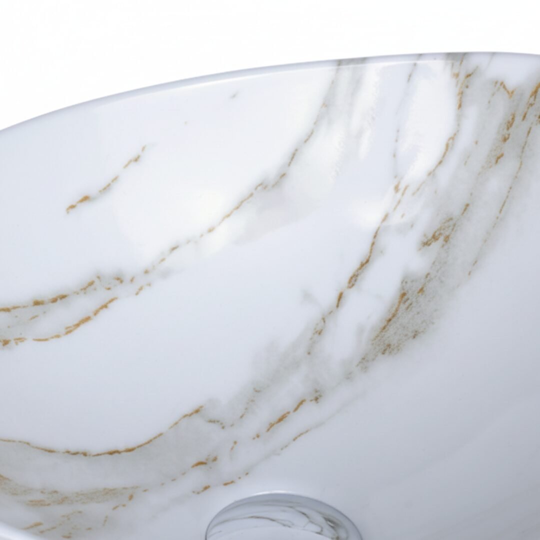 Elevate your space with this modern oval wash basin. Crafted from high-quality ceramic with a stunning amber-toned marble effect, it offers the beauty of stone with the practicality of ceramic. The unique veining creates a warm and sophisticated focal point for your bathroom.