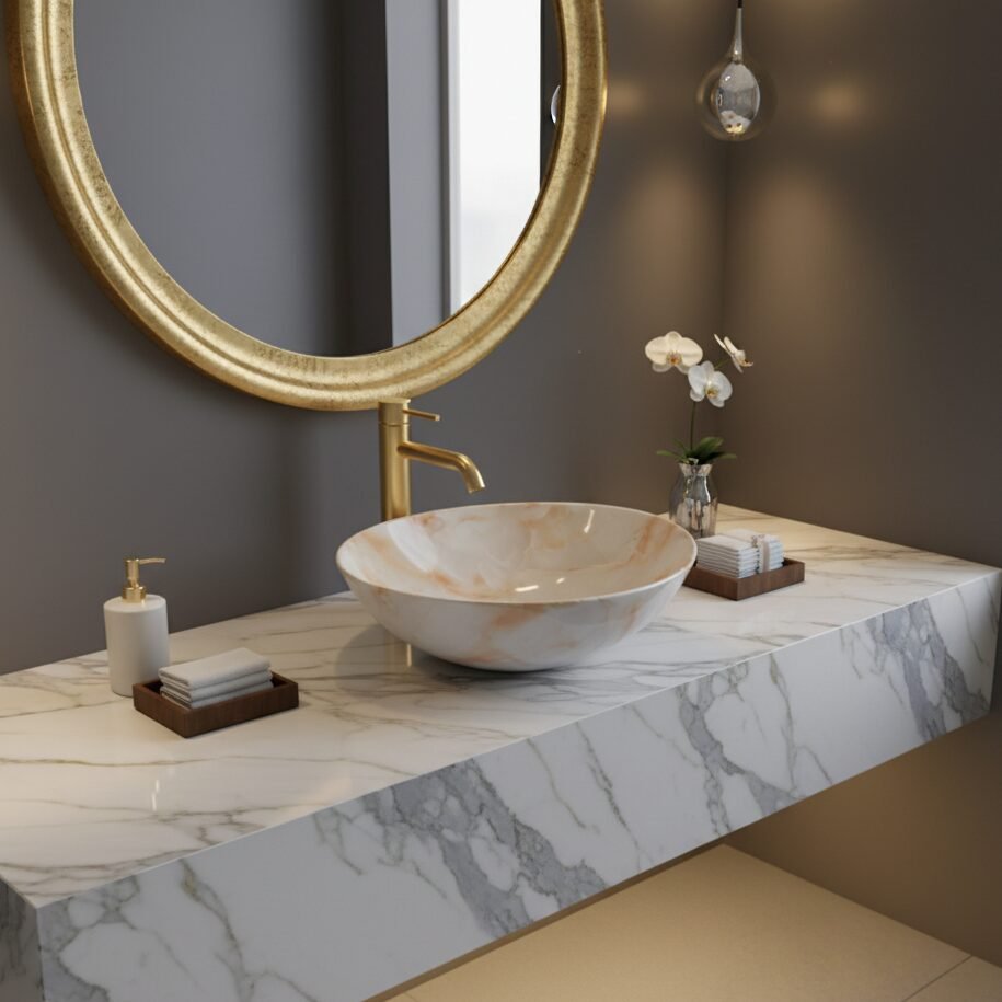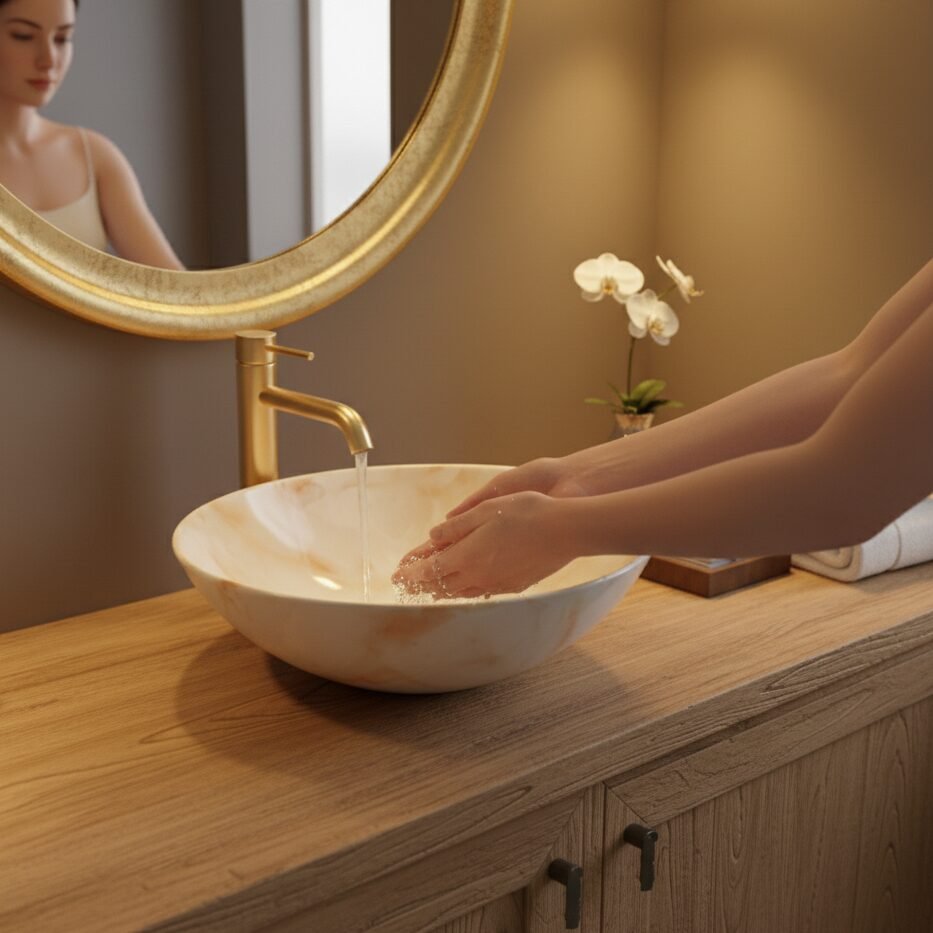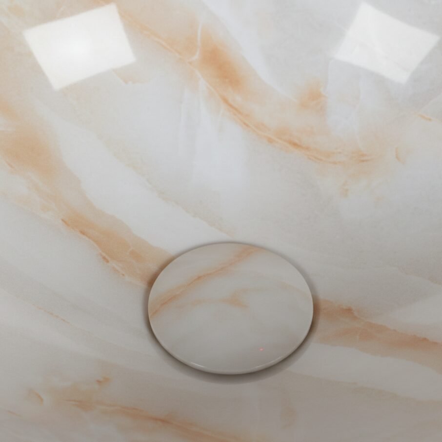 Elevate your space with this modern oval wash basin. Crafted from high-quality ceramic with a stunning amber-toned marble effect, it offers the beauty of stone with the practicality of ceramic. The unique veining creates a warm and sophisticated focal point for your bathroom.