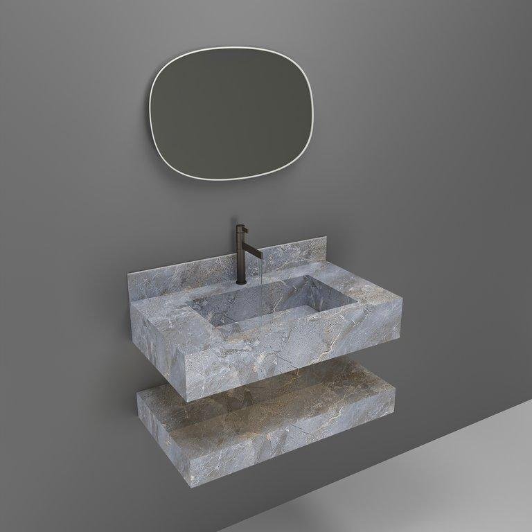 Elevate your bathroom aesthetic with this luxurious floating sink. Crafted from premium stone with rich teal and earthy brown tones, this vanity features a seamless rectangular basin and sleek, minimalist lines. The integrated backsplash and matte black faucet add a touch of modern elegance, while the matching lower shelf provides functional storage.