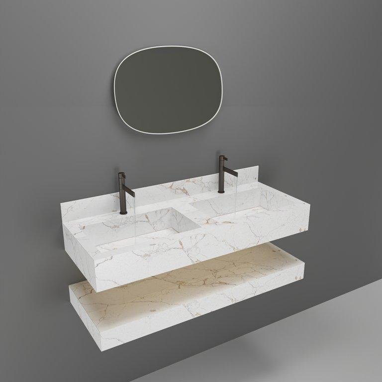 Elevate your bathroom aesthetic with this luxurious floating sink. Crafted from premium stone with rich teal and earthy brown tones, this vanity features a seamless rectangular basin and sleek, minimalist lines. The integrated backsplash and matte black faucet add a touch of modern elegance, while the matching lower shelf provides functional storage.