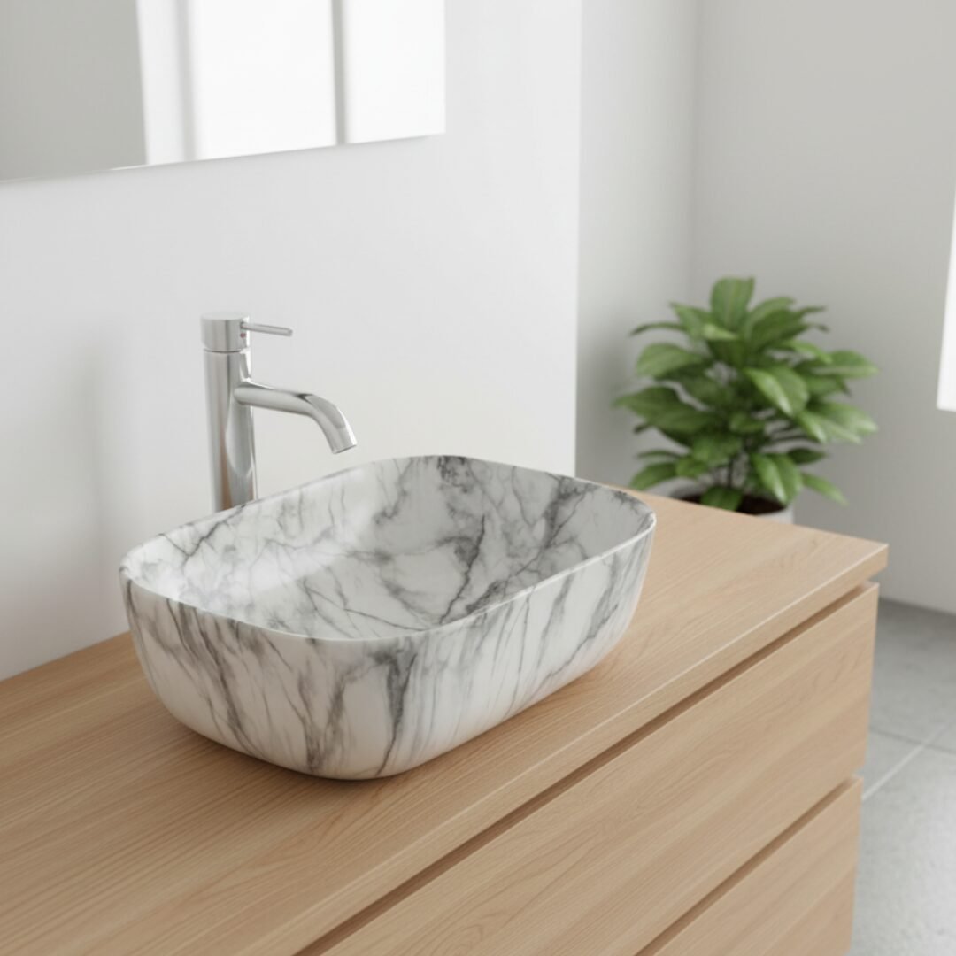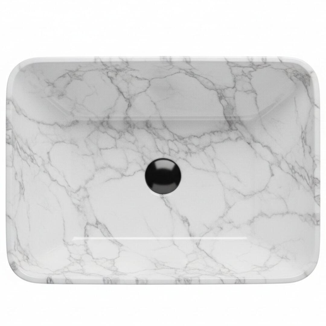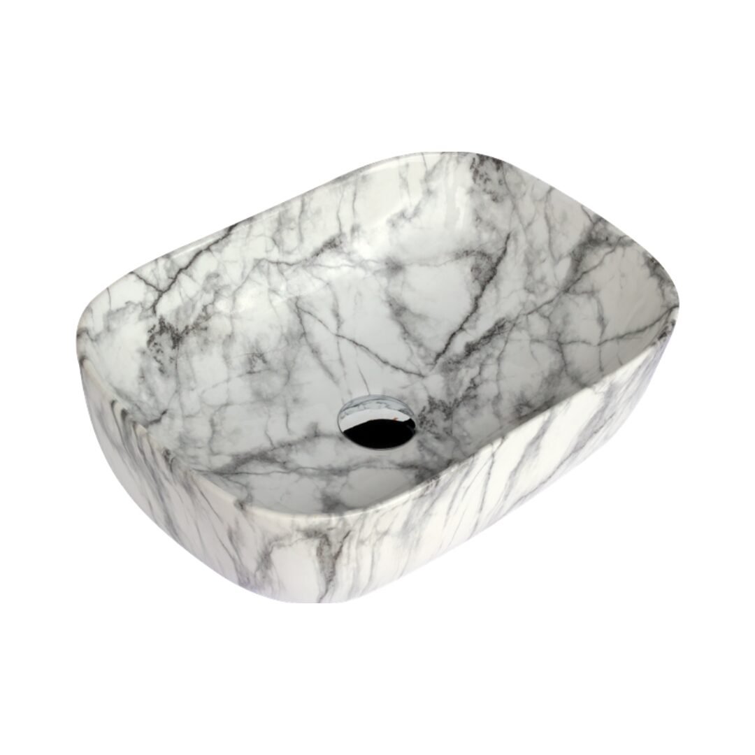 This is a stylish and modern rectangular ceramic wash basin, perfect for enhancing the aesthetic appeal of any bathroom. The basin features a pristine white base adorned with an elegant gold marble vein pattern, giving it a luxurious and contemporary look. Its glossy finish adds a touch of sophistication while making the surface easy to clean and maintain. The gently curved edges provide a sleek and smooth appearance, ensuring it blends seamlessly with various bathroom styles. The basin is designed for countertop installation, making it ideal for vanity setups in both residential and commercial spaces. It includes a central drain hole, compatible with standard drain fittings, ensuring efficient water drainage. Its compact yet practical design provides ample space for everyday use while maintaining a minimalist profile. This wash basin is an excellent choice for those seeking to combine functionality with high-end design.