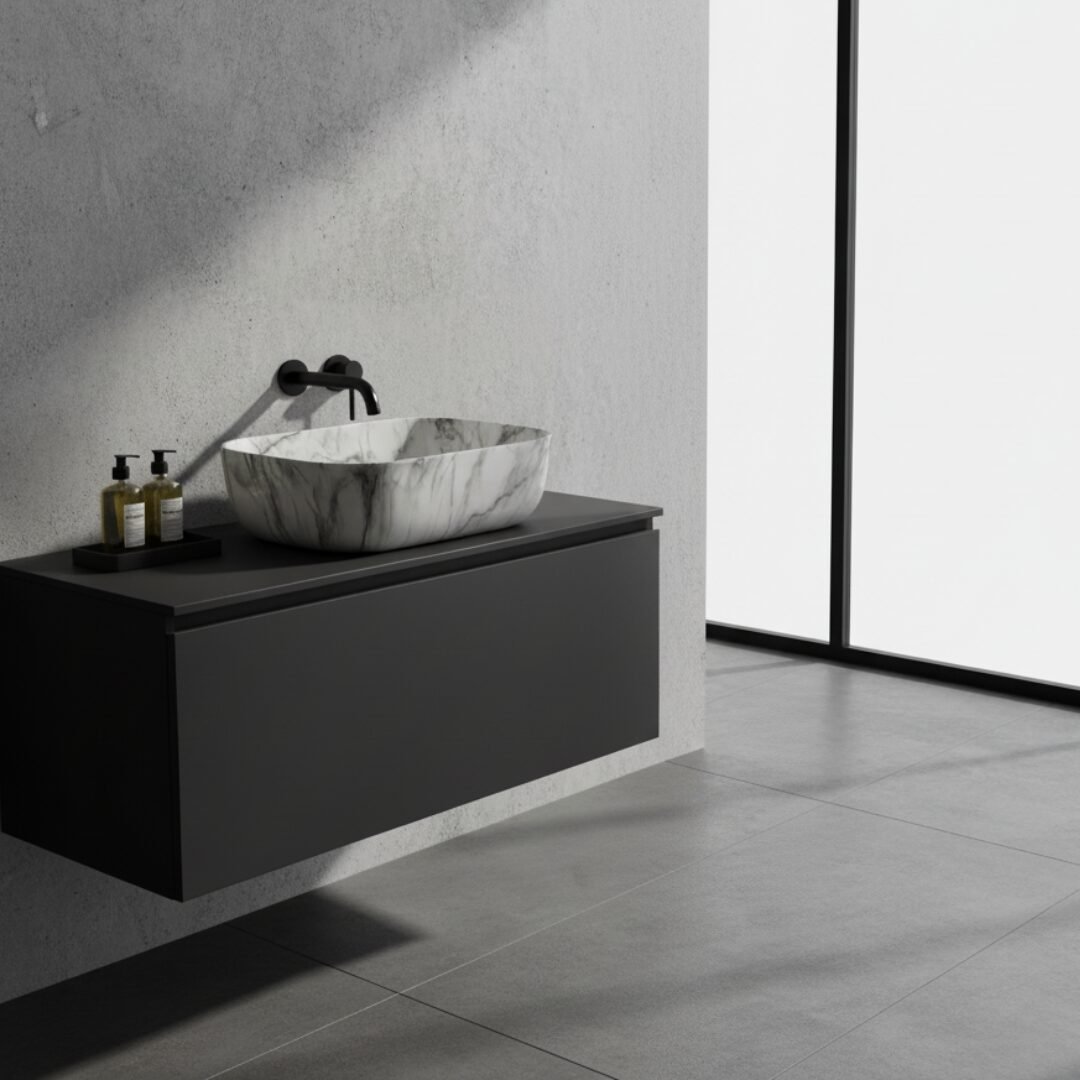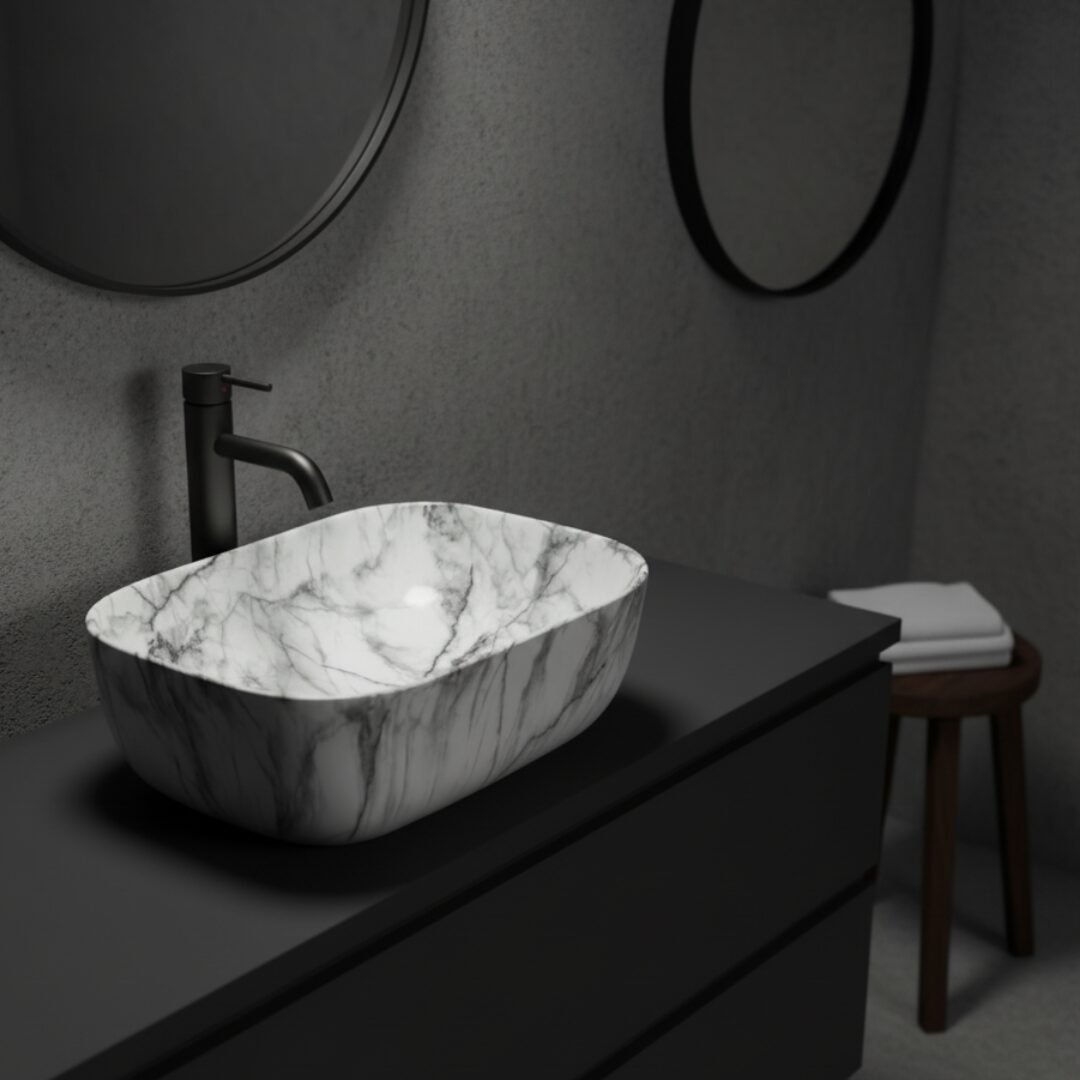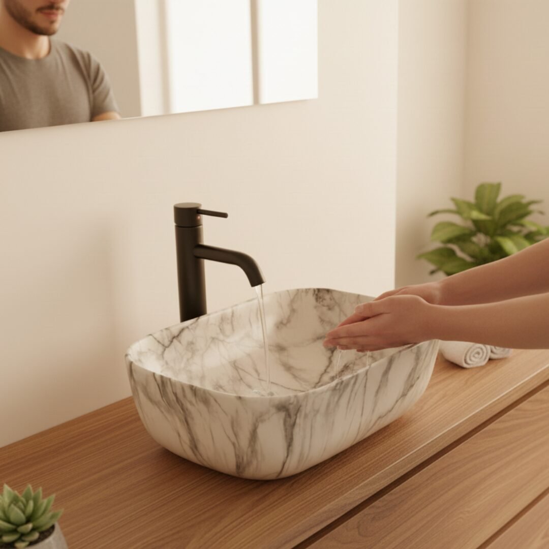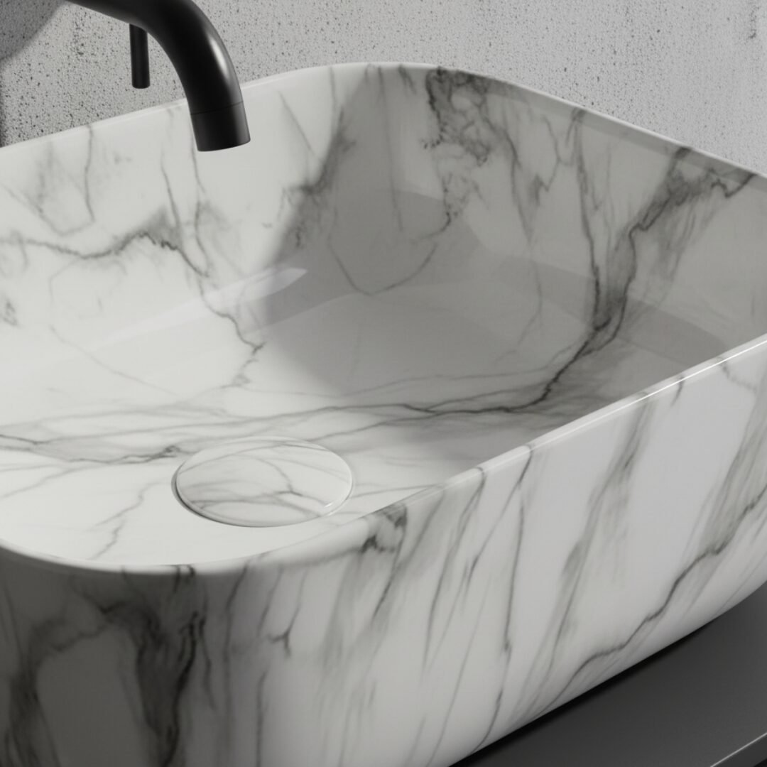 This is a stylish and modern rectangular ceramic wash basin, perfect for enhancing the aesthetic appeal of any bathroom. The basin features a pristine white base adorned with an elegant gold marble vein pattern, giving it a luxurious and contemporary look. Its glossy finish adds a touch of sophistication while making the surface easy to clean and maintain. The gently curved edges provide a sleek and smooth appearance, ensuring it blends seamlessly with various bathroom styles. The basin is designed for countertop installation, making it ideal for vanity setups in both residential and commercial spaces. It includes a central drain hole, compatible with standard drain fittings, ensuring efficient water drainage. Its compact yet practical design provides ample space for everyday use while maintaining a minimalist profile. This wash basin is an excellent choice for those seeking to combine functionality with high-end design.