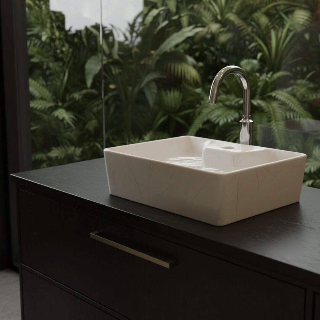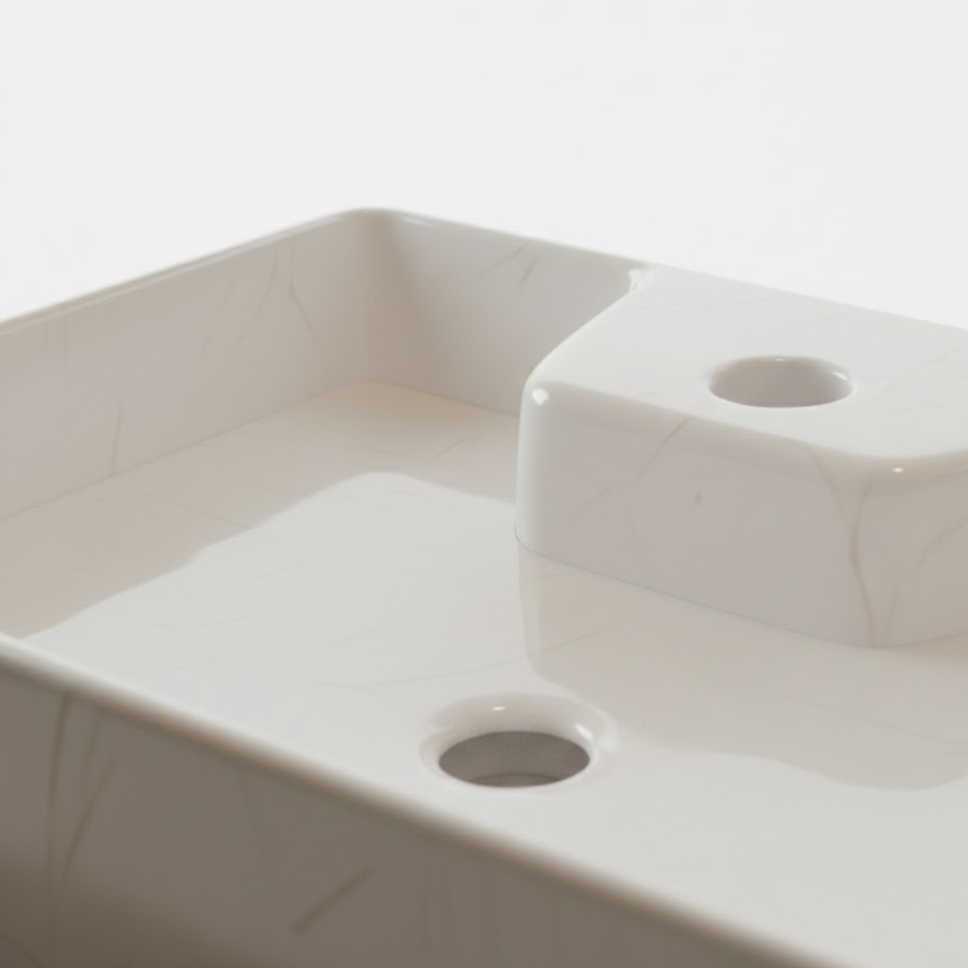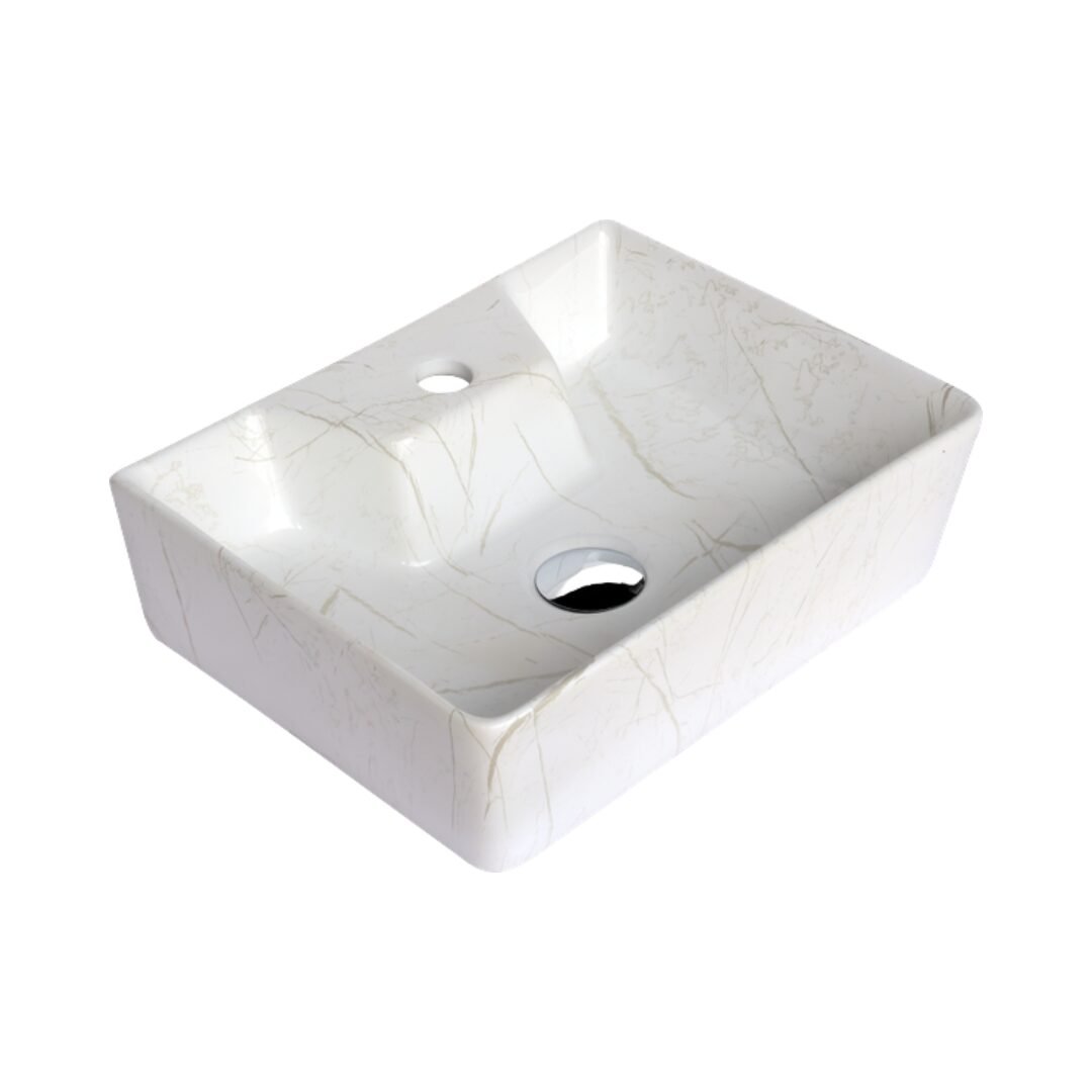This is a stylish and modern rectangular ceramic wash basin, perfect for enhancing the aesthetic appeal of any bathroom. The basin features a pristine white base adorned with an elegant gold marble vein pattern, giving it a luxurious and contemporary look. Its glossy finish adds a touch of sophistication while making the surface easy to clean and maintain. The gently curved edges provide a sleek and smooth appearance, ensuring it blends seamlessly with various bathroom styles. The basin is designed for countertop installation, making it ideal for vanity setups in both residential and commercial spaces. It includes a central drain hole, compatible with standard drain fittings, ensuring efficient water drainage. Its compact yet practical design provides ample space for everyday use while maintaining a minimalist profile. This wash basin is an excellent choice for those seeking to combine functionality with high-end design.