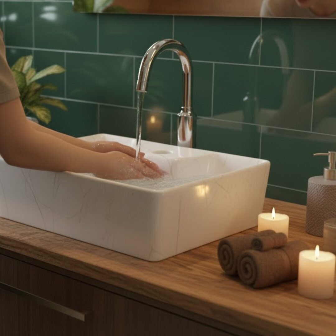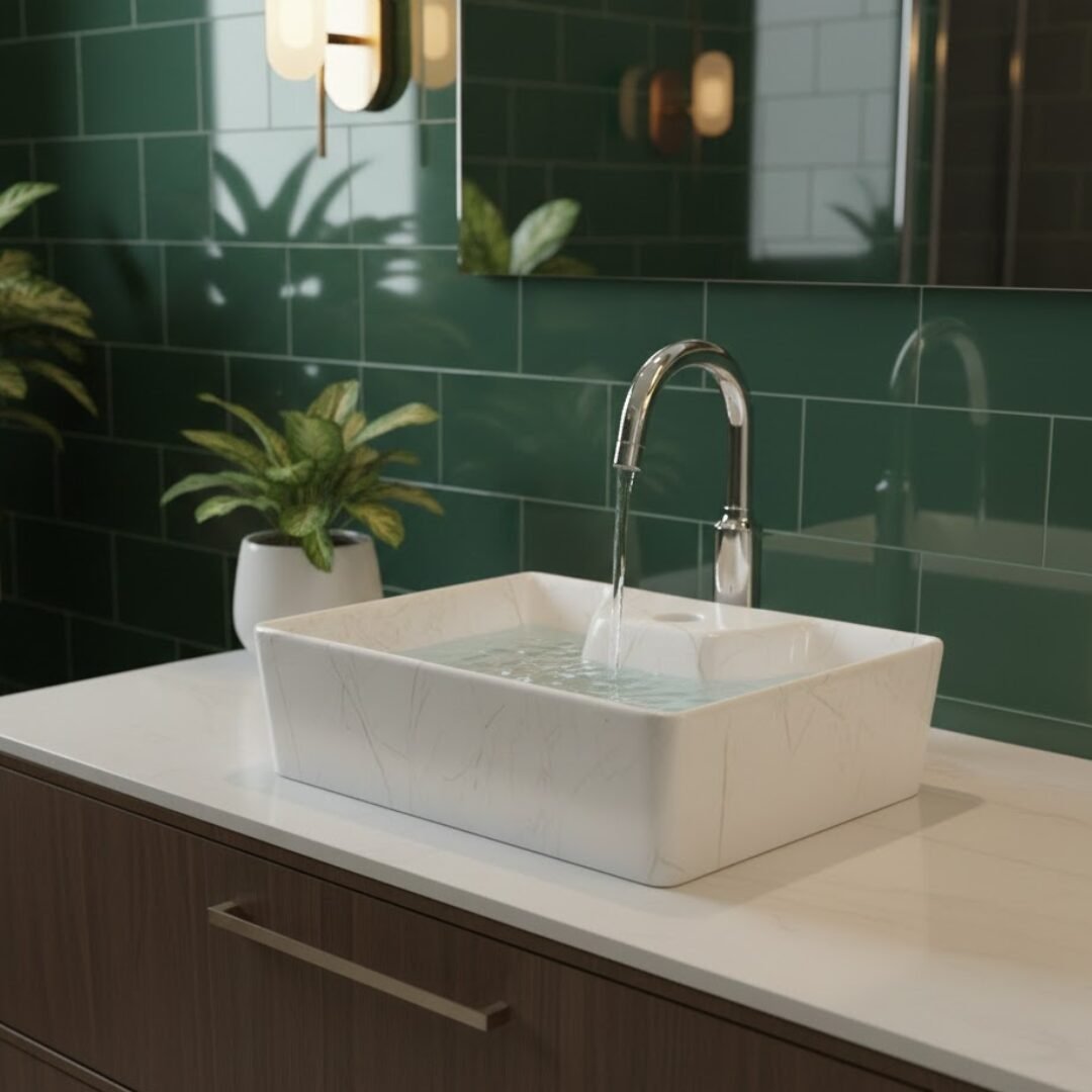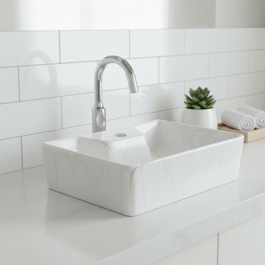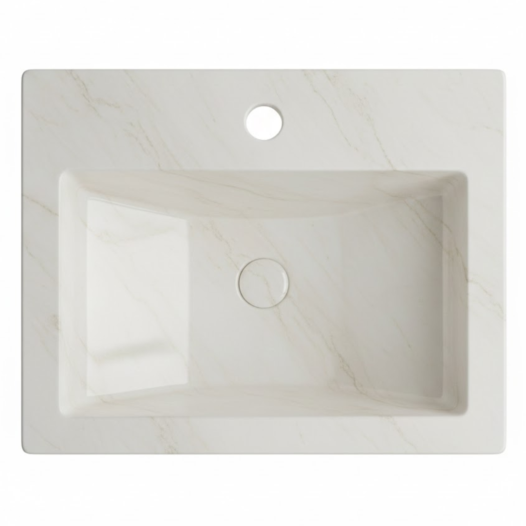This is a stylish and modern rectangular ceramic wash basin, perfect for enhancing the aesthetic appeal of any bathroom. The basin features a pristine white base adorned with an elegant gold marble vein pattern, giving it a luxurious and contemporary look. Its glossy finish adds a touch of sophistication while making the surface easy to clean and maintain. The gently curved edges provide a sleek and smooth appearance, ensuring it blends seamlessly with various bathroom styles. The basin is designed for countertop installation, making it ideal for vanity setups in both residential and commercial spaces. It includes a central drain hole, compatible with standard drain fittings, ensuring efficient water drainage. Its compact yet practical design provides ample space for everyday use while maintaining a minimalist profile. This wash basin is an excellent choice for those seeking to combine functionality with high-end design.